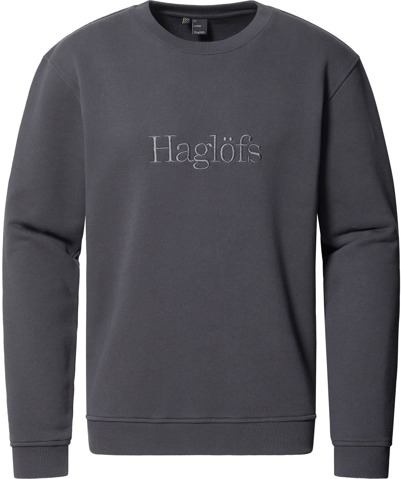 Haglöfs Crewneck-tröjan har klassiska inslag: mjukt bomullsmaterial, en rund halsringning och ribbstickade ärmslut, fåll och krage. En bomullströja är ett utmärkt val för vardagskläder, så länge det inte finns någon risk att bli för kall om svett dämpar tyget. – Avslappnad passform – Huvudmaterialet är ren organisk bomull, med 5% elastan i de ribbade sektionerna – Snygg broderad Haglöfs logotyp på bröstet – Kan tvättas i maskin i 40°C Obs! Färgalternativet ”True Black” är faktiskt märkbart grått.